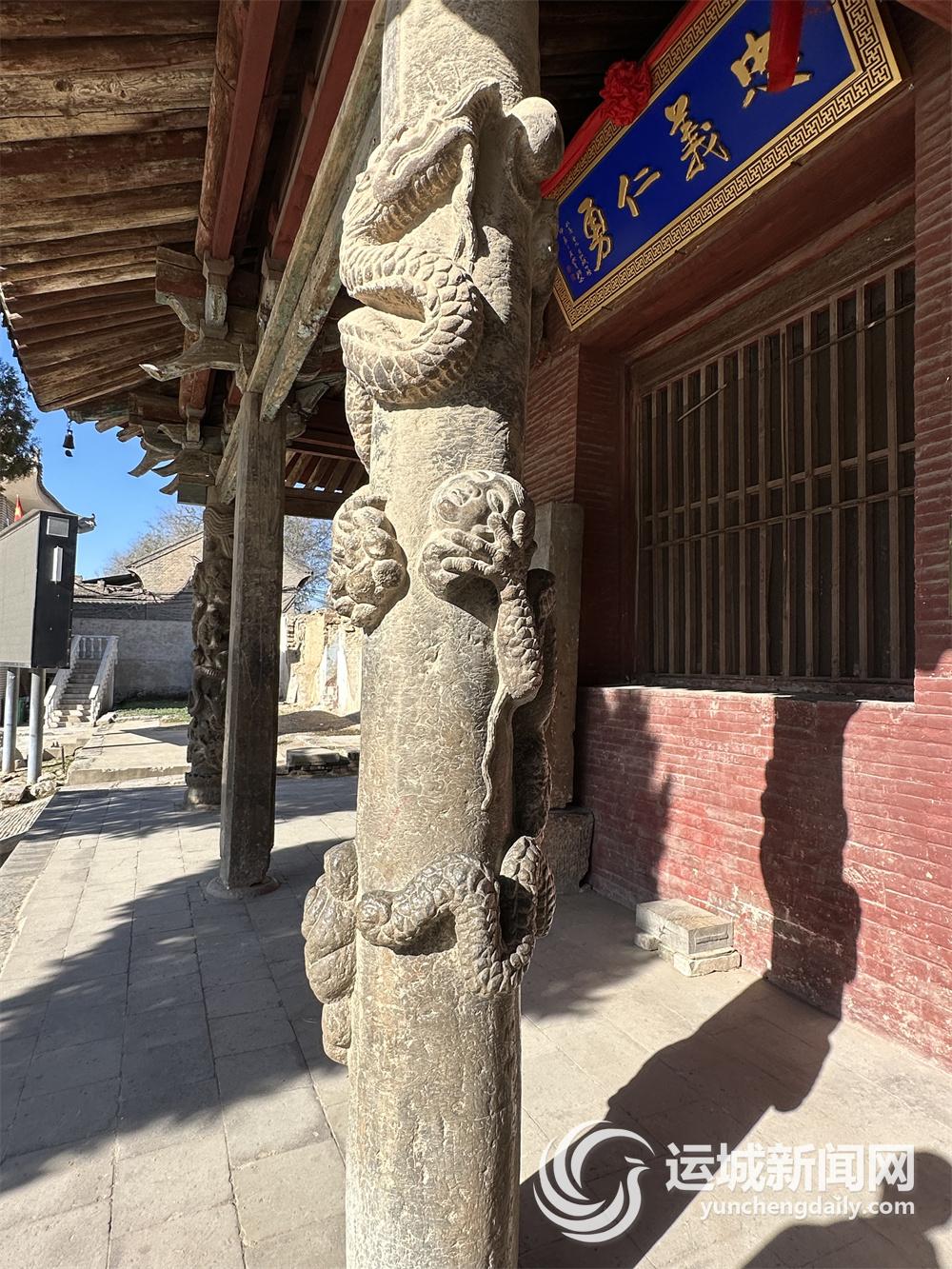 该村党总支书记、村委会主任吕磊正带领着村民进行每月的环境清洁日卫生整治活动。据他介绍,这些蟠龙柱并不属于同一时期,而且上面都刻有捐赠者姓名,以及捐赠原因和时间。比如,龙凤呈祥的蟠龙柱上就镌刻着一位绛州熟汾户籍的施主,居住在泉掌镇,愿意出钱捐蟠龙柱,祈愿子孙昌盛。
