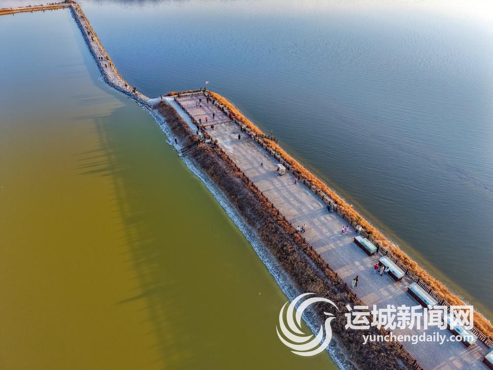 12月1日,随着气温下降,运城盐湖呈现出一幅如诗如画的美景,行走于堤埝上的游客宛如身处天空之境。