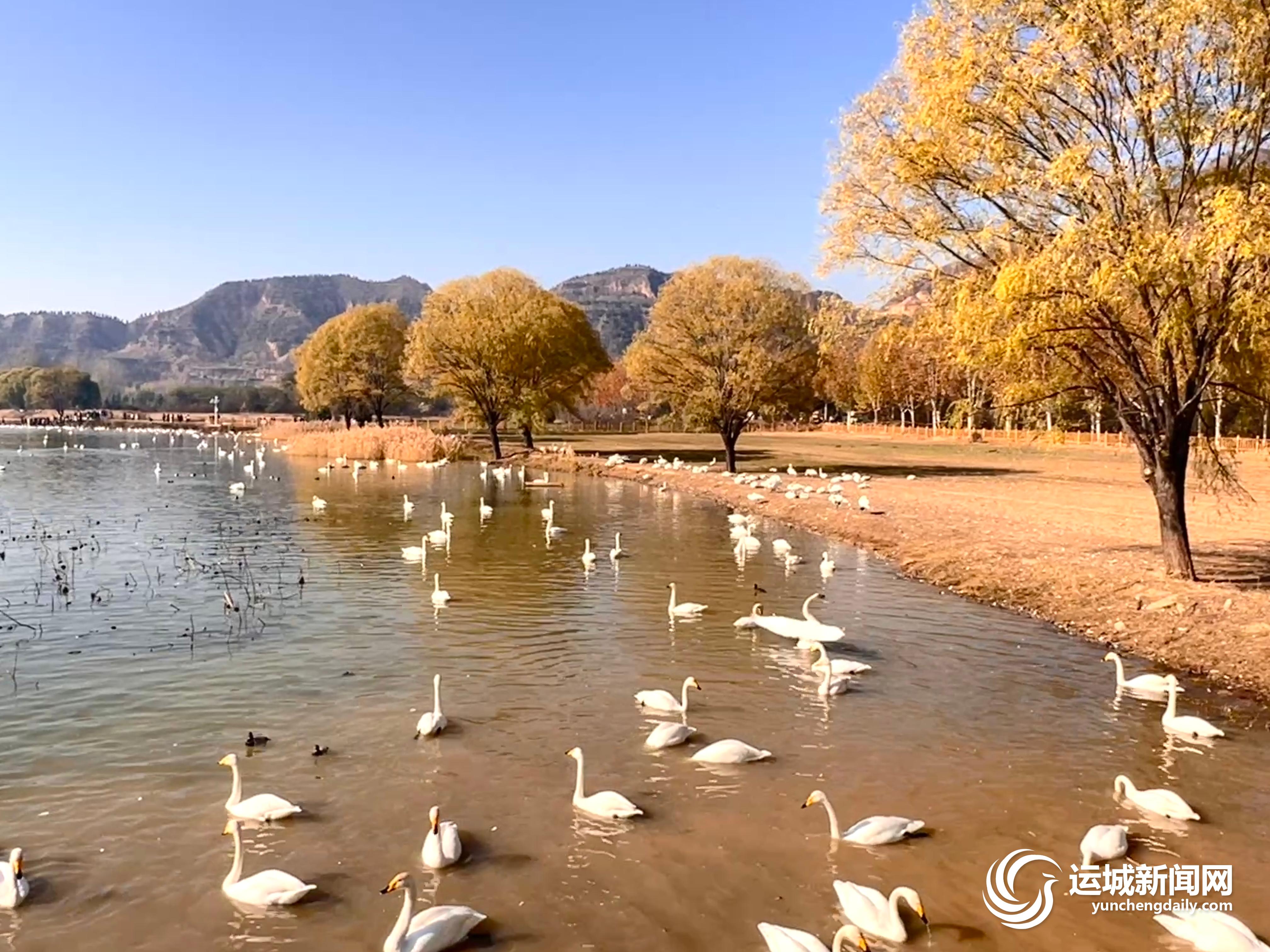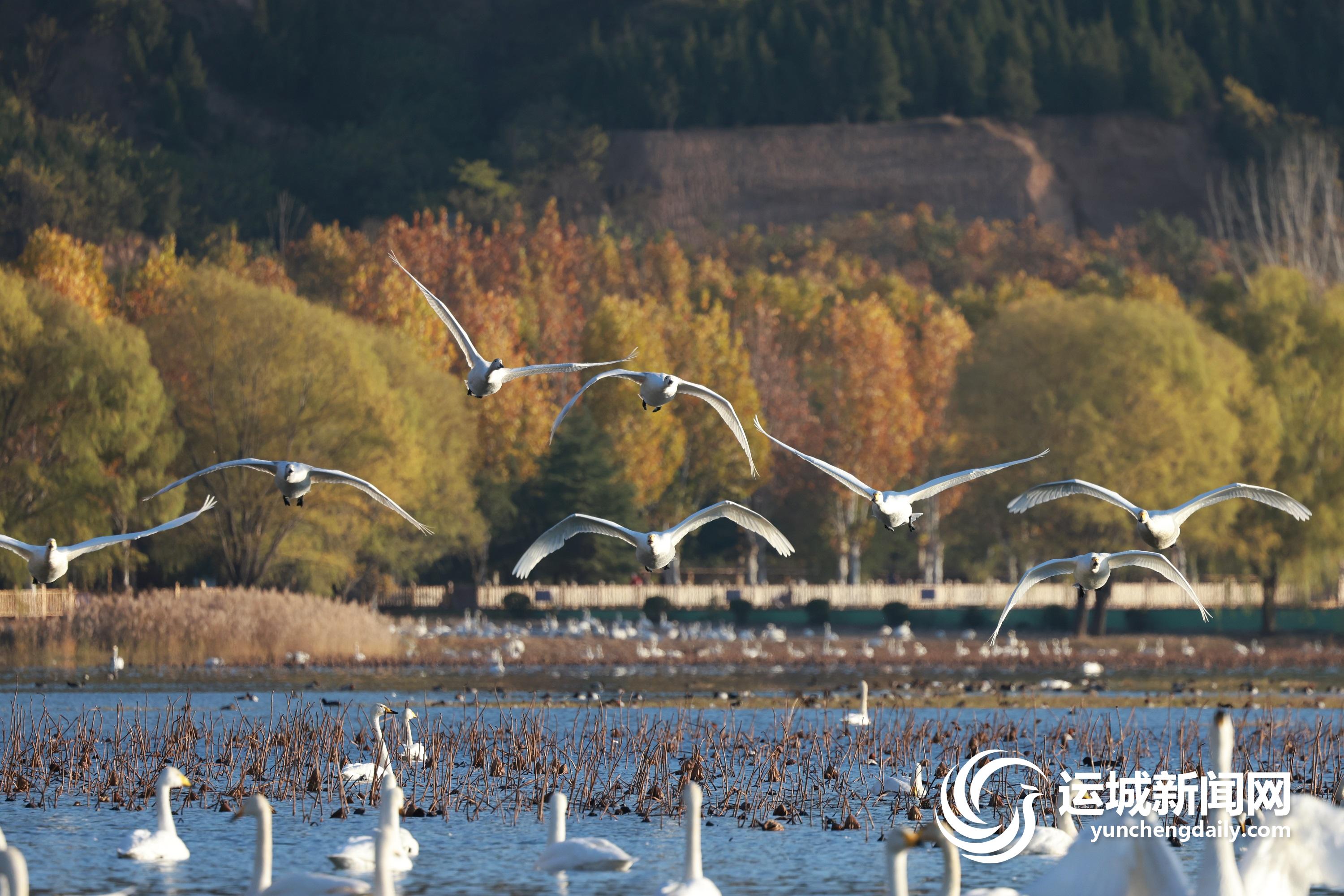 近日,在平陆县三湾大天鹅生态湿地公园内,成群的天鹅时而自由觅食,时而展翅飞翔,吸引了众多游客观赏拍照,形成了一幅人与天鹅和谐共处的美好画卷。