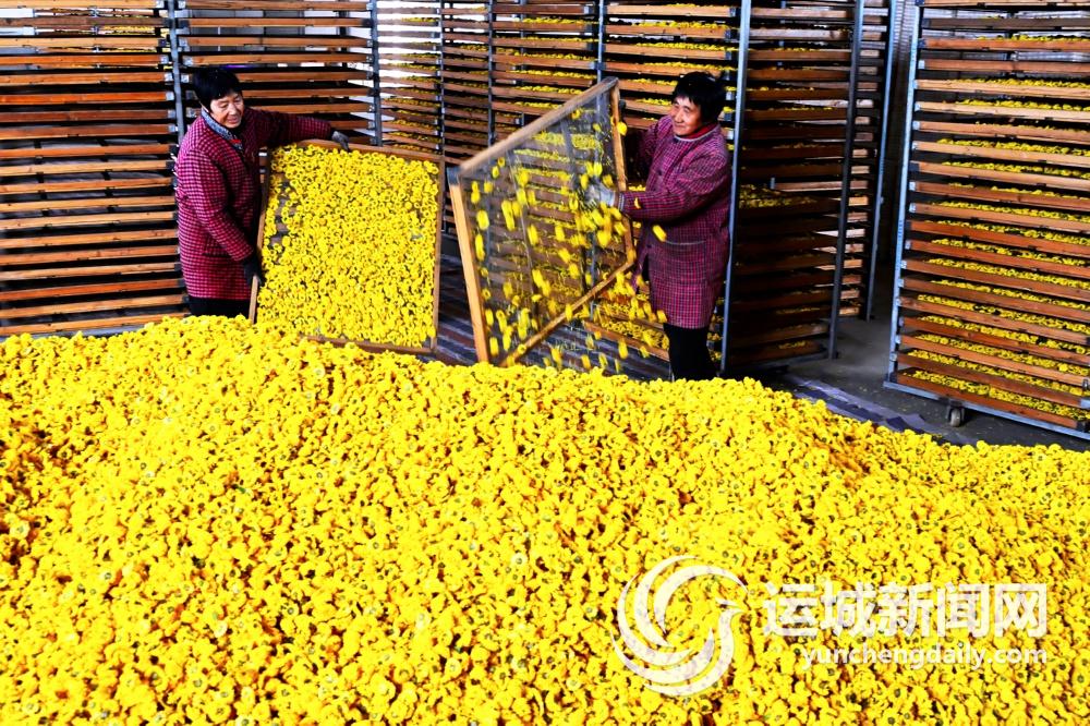 12月3日,在垣曲县鼎诺种养专业合作社,员工将烘烤好的茶菊集中起来,准备包装销售。