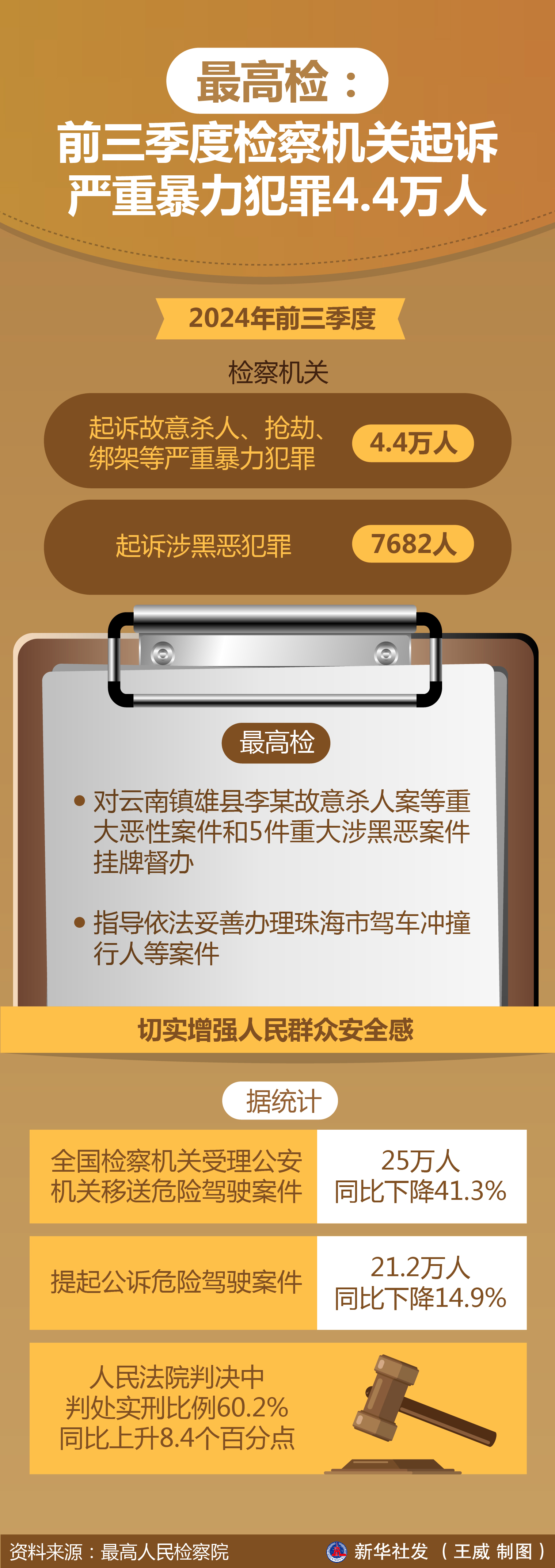 从最高人民检察院12月5日举行的新闻发布会上获悉,2024年前三季度检察机关起诉故意杀人、抢劫、绑架等严重暴力犯罪4.4万人,起诉涉黑恶犯罪7682人,最高检对云南镇雄县李某故意杀人案等重大恶性案件和5件重大涉黑恶案件挂牌督办,指导依法妥善办理珠海市驾车冲撞行人等案件,切实增强人民群众安全感。