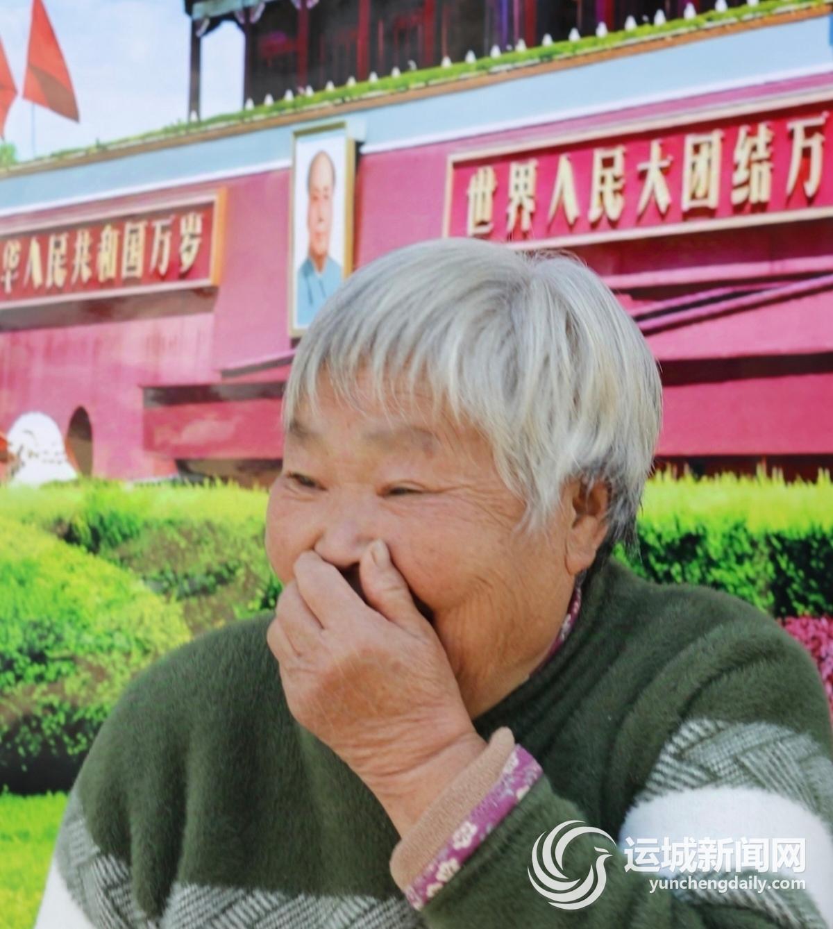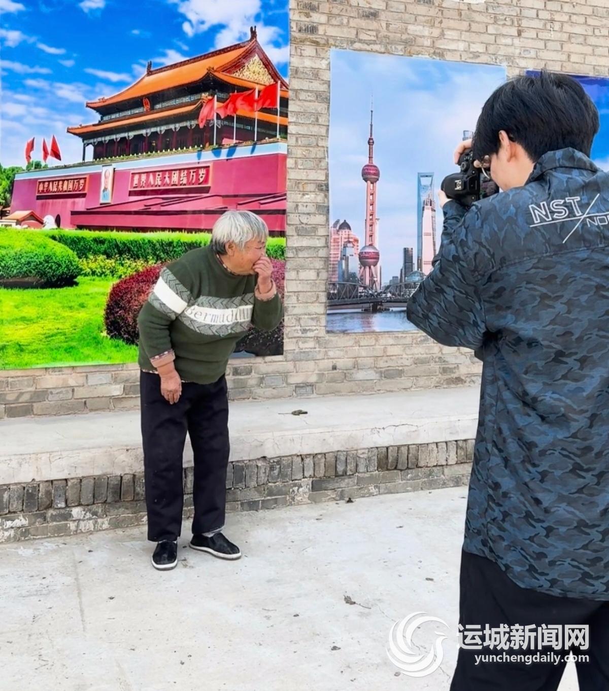 在王怡和打印出来的背景海报里,有北京的天安门、上海的东方明珠,还有广州的广州塔。王怡和与同伴将免费拍照的第一站,选在了芮城县陌南镇朱吕村。提前联系好村干部后,他们便前往村里为村民拍照。在村里找一面宽阔的墙,贴上背景图、调试好相机后,王怡和与同伴便开始在村里寻找想要拍照的老人。
