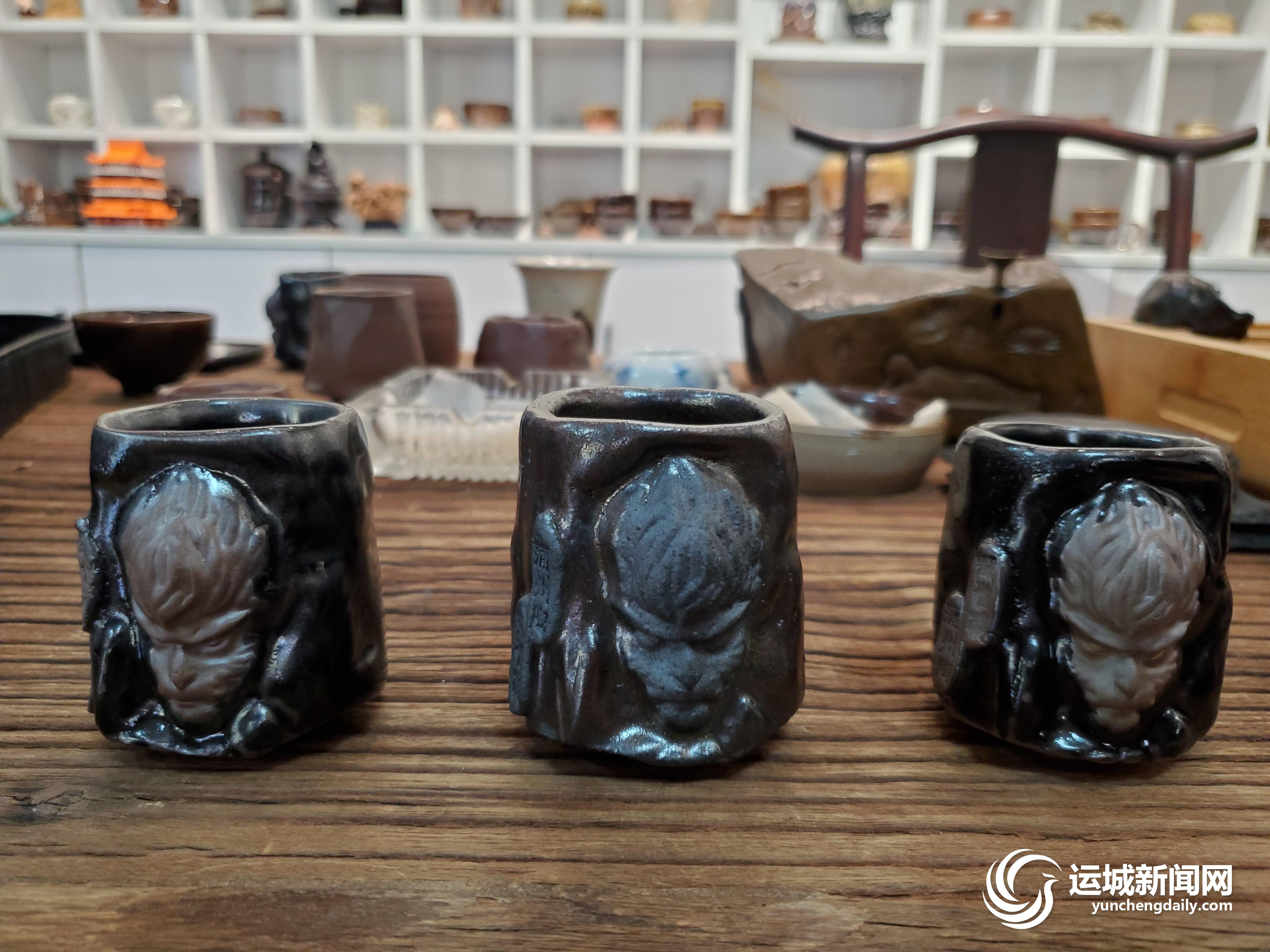 走进李文龙的蒲州陶工作室,展览架上一件件玲珑精致的陶制品夺人眼球:杯盏茶碗造型各异,极具永济地域文化特色的“鹳雀楼”“黄河大铁牛”等陶制品活泼灵动,“悟空创意杯”个性十足……