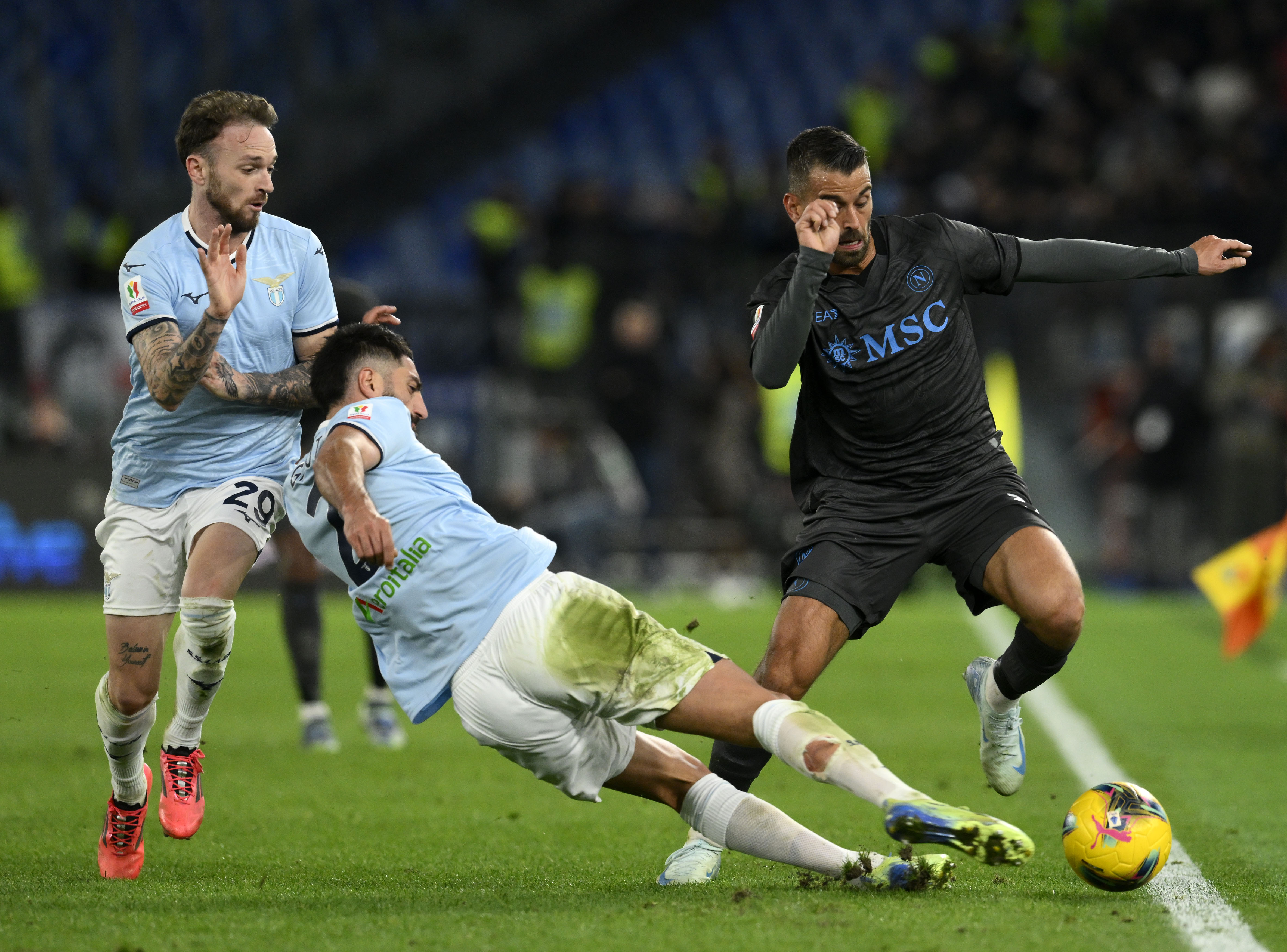 12月5日,拉齐奥队球员吉戈(中)与那不勒斯队球员斯皮纳佐拉(右)拼抢。当日,在意大利罗马举行的2024-2025赛季意大利杯足球赛八分之一决赛中,拉齐奥队主场3比1战胜那不勒斯队,晋级八强。