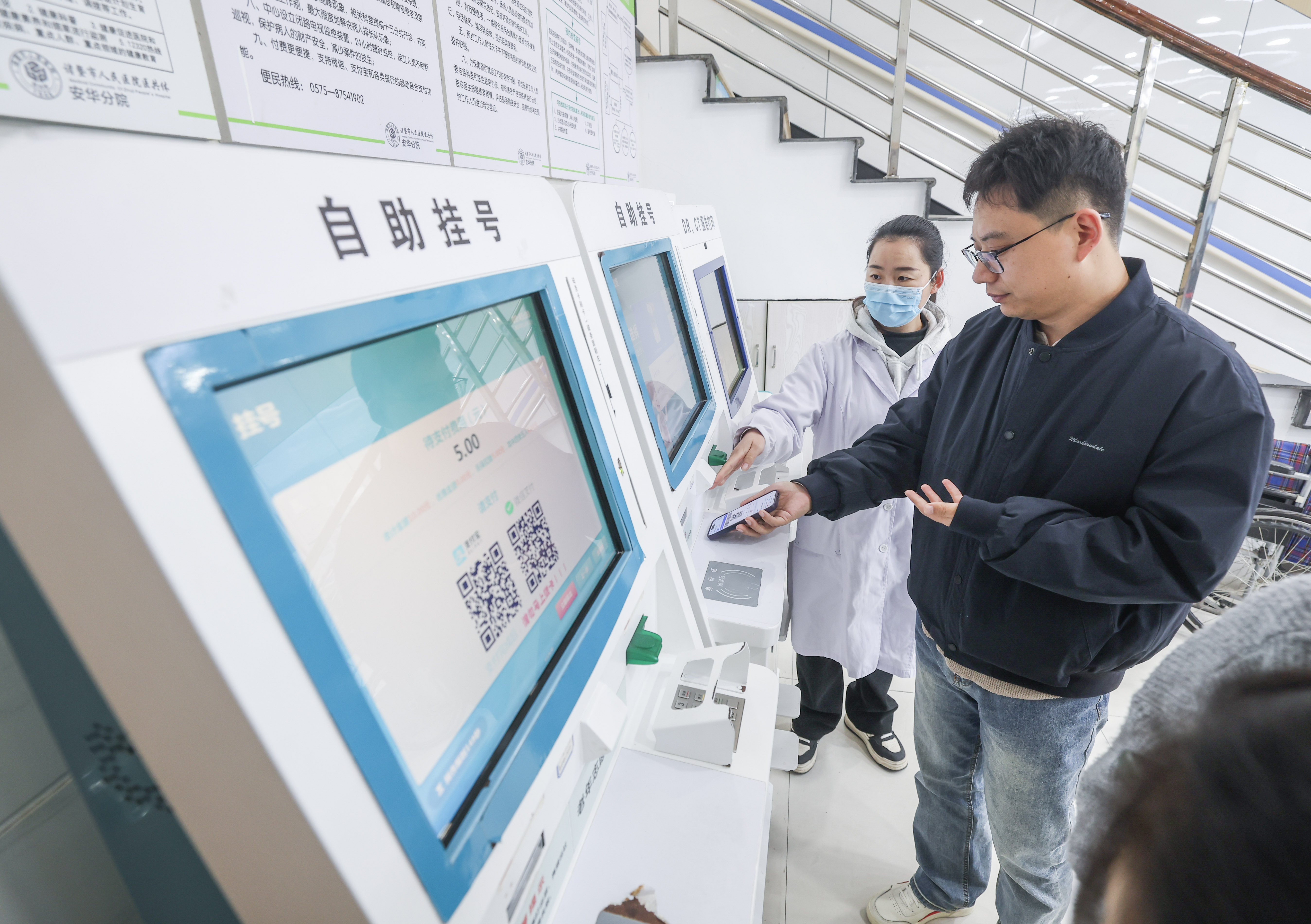 在浙江省诸暨市安华镇中心卫生院,医务人员在指导患者用自助挂号机挂号。