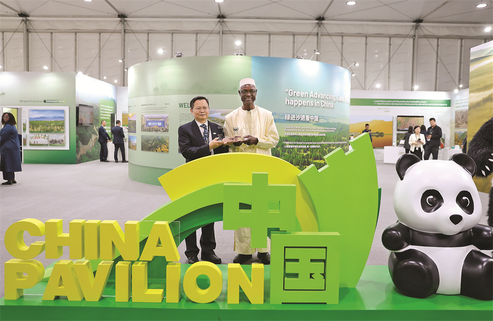 12月6日,在位于沙特阿拉伯利雅得的《联合国防治荒漠化公约》第十六届缔约方大会(COP16)中国馆,《公约》秘书处执行秘书易卜拉欣·蒂奥(右)为中方颁发“联合国防治荒漠化公约30周年”纪念牌。