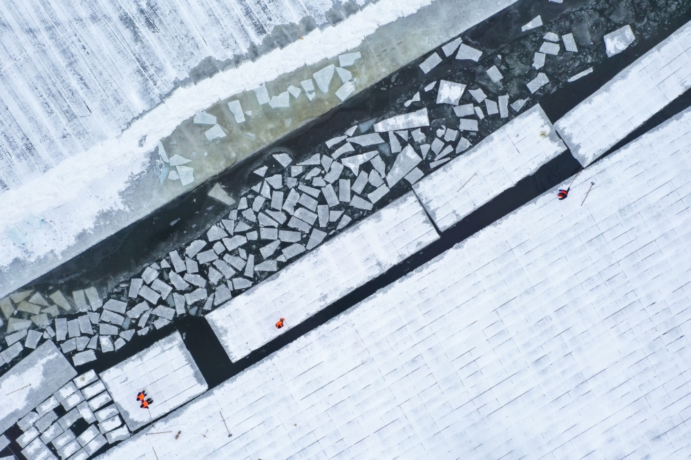 12月9日,工人在松花江哈尔滨段采冰(无人机照片)。