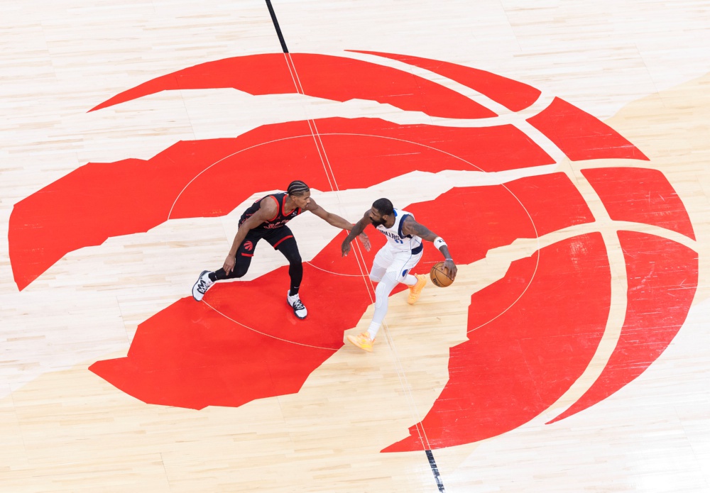 12月7日,猛龙队球员阿巴基(左)在比赛中防守独行侠队球员欧文。当日,在2024~2025赛季NBA常规赛中,多伦多猛龙队主场118比125不敌达拉斯独行侠队。 新华社发(邹峥 摄)