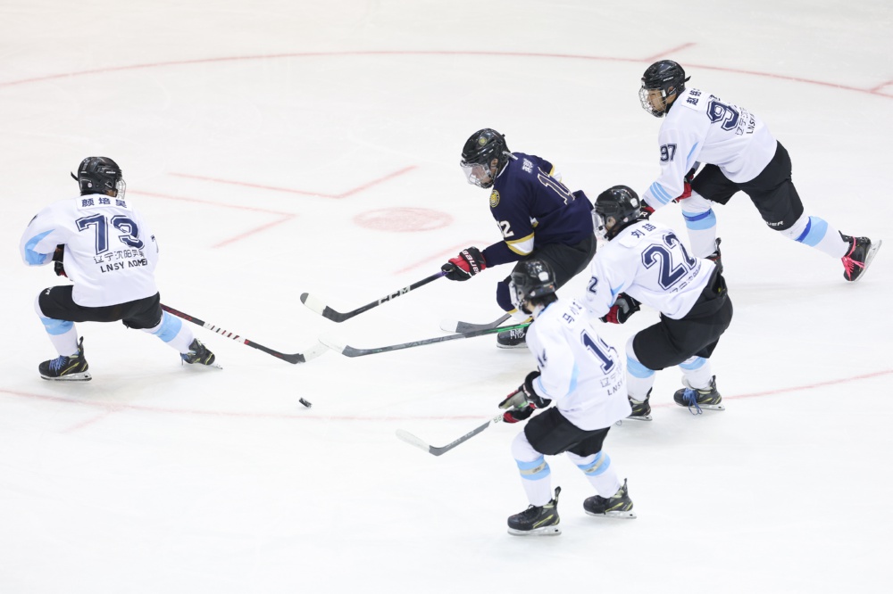 12月8日,北京京狮男子冰球队球员蒋思雄(中)在比赛中突破。