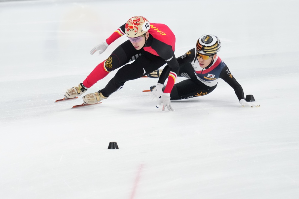 12月8日,中国队选手刘少昂(前)在比赛中,韩国队选手朴知元在比赛中摔倒。