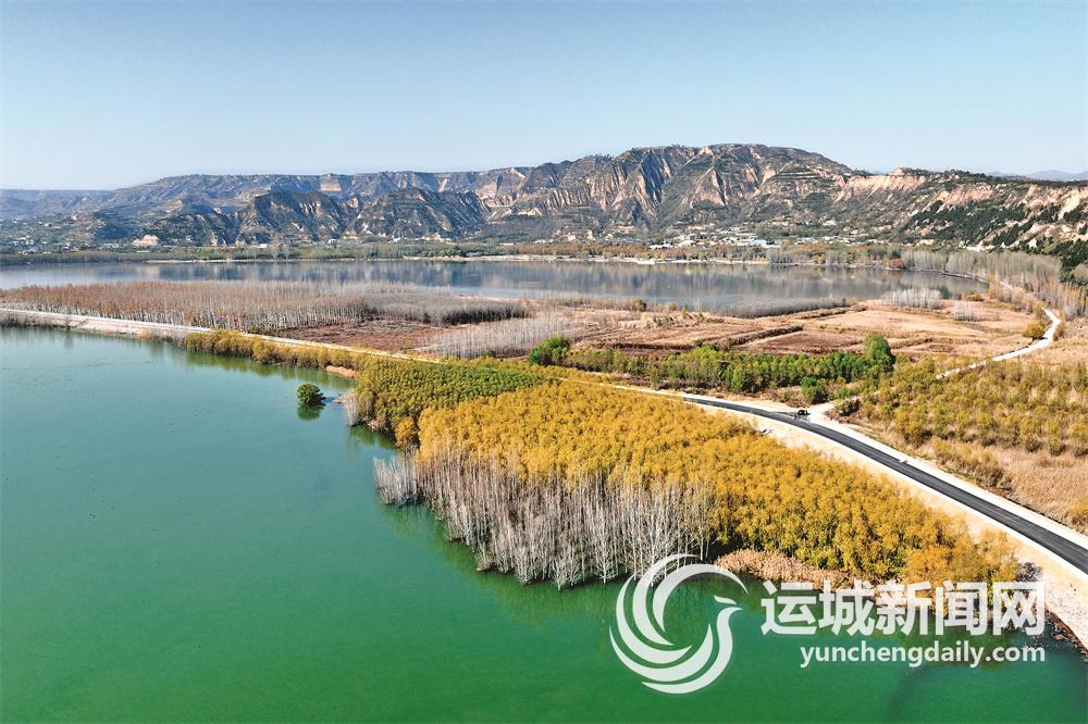 大雪时节,平陆县黄河湿地,金黄与碧绿交织,蓝天与苍山相衬,宛如画卷。