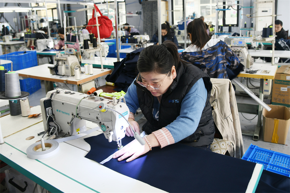 12月11日,在闻喜县桐城镇西官庄村人从众制衣公司的就业帮扶车间,经过培训新上岗的农村妇女在加工服装。