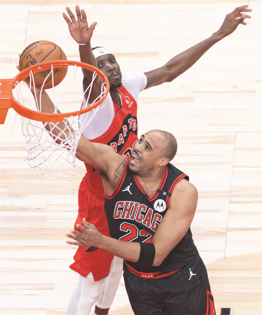 当日,在2024~2025赛季NBA常规赛中,多伦多猛龙队主场121比122不敌芝加哥公牛队。新华社发(邹峥 摄)