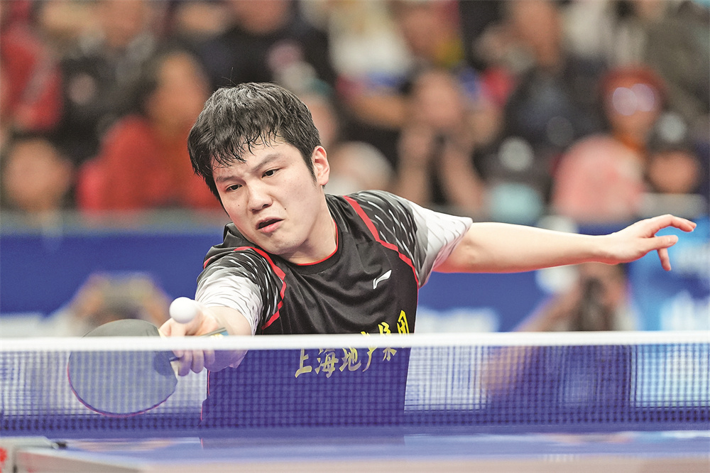 12月16日,上海地产集团队选手樊振东在单打比赛中回球,他3比1战胜山东魏桥·向尚运动队选手王楚钦。
