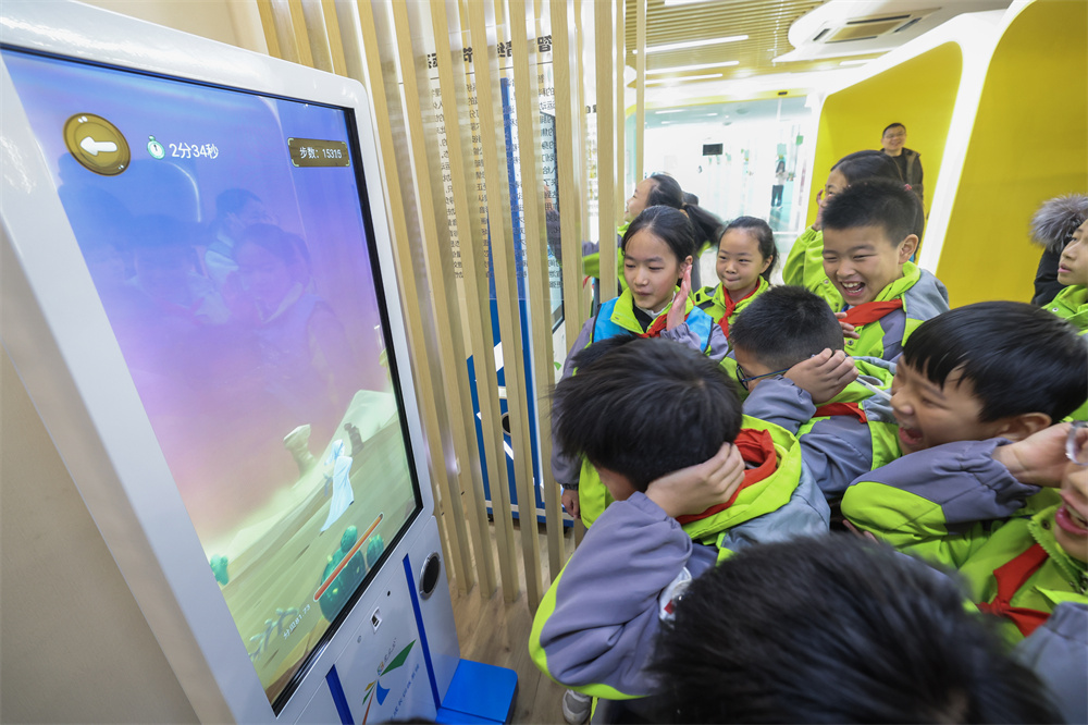 12月17日,在浙江省嘉兴市实验小学科技城校区内,学生们用3D游戏来减压。
