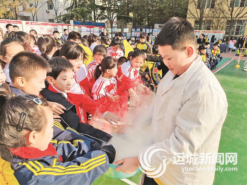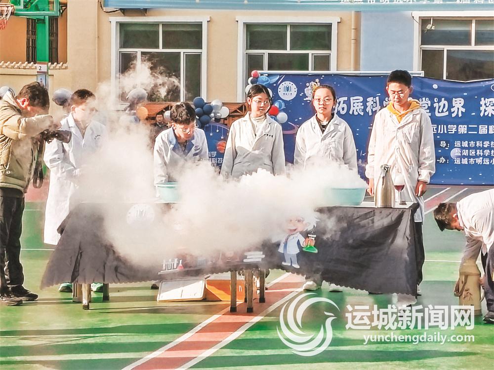 “哇,好神奇!”在云雾缭绕的干冰实验现场,小朋友们不由惊叹。六年级学生陈艺瑄告诉大家,这是由于干冰升华吸热,导致附近空气温度骤降,空气中的水蒸气遇冷液化就形成了雾气。“神奇实验的背后隐藏着科学原理,这提醒我们要不断探索、主动思考,善于发现生活中的科学。”