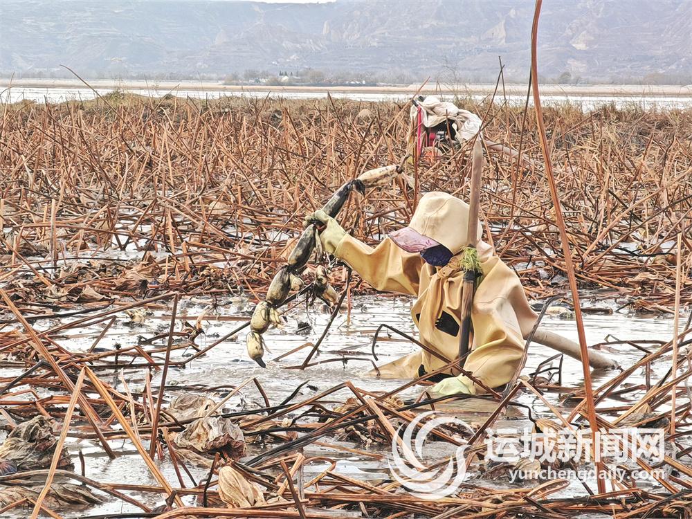 在摸索时,黄河岸畔的挖藕人需要一直保持着肩膀向下探的姿势,有时还要跪在淤泥里一点点爬行摸索,一干就是一整天。挖藕结束后,他们能回家洗个热水澡,美美地喝上一碗热腾腾的汤,就已经是每天最知足的事情了。