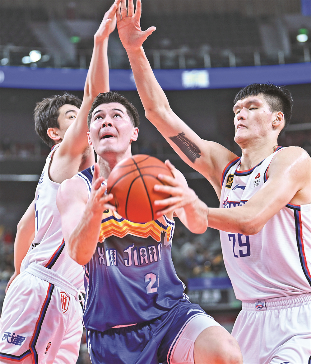 12月18日,新疆伊力特队球员阿不都沙拉木(中)在天津先行者队球员高世鳌(右)、叶尔潘的防守下上篮。当日,在2024~2025赛季中国男子篮球职业联赛(CBA)常规赛第19轮比赛中,新疆伊力特队主场104比83战胜天津先行者队。