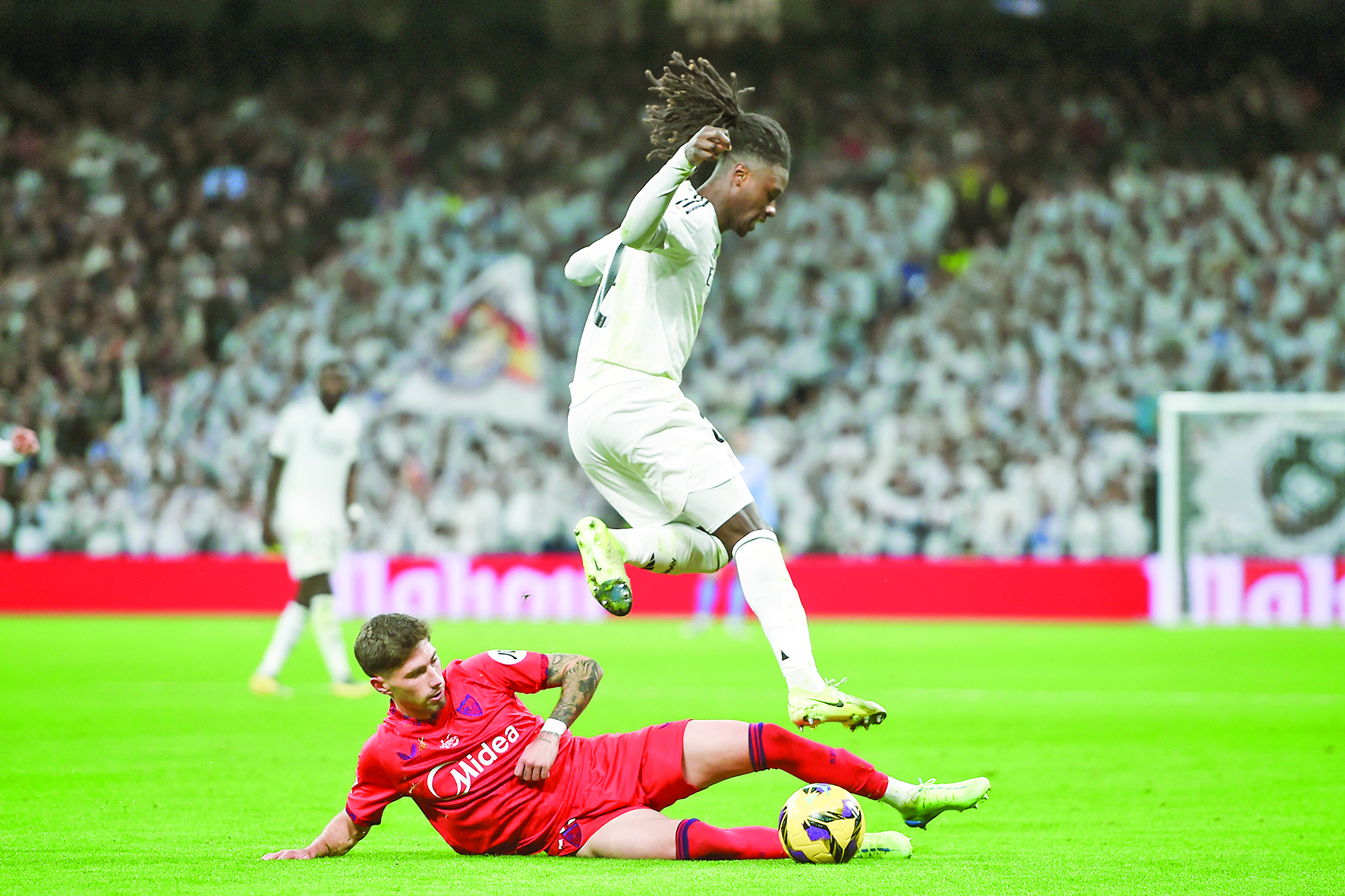 12月22日,皇家马德里队球员卡马文加(上)和塞维利亚队球员卡尔莫纳在比赛中拼抢。当日,在2024~2025赛季西班牙足球甲级联赛第18轮比赛中,皇家马德里队主场4比2战胜塞维利亚队。