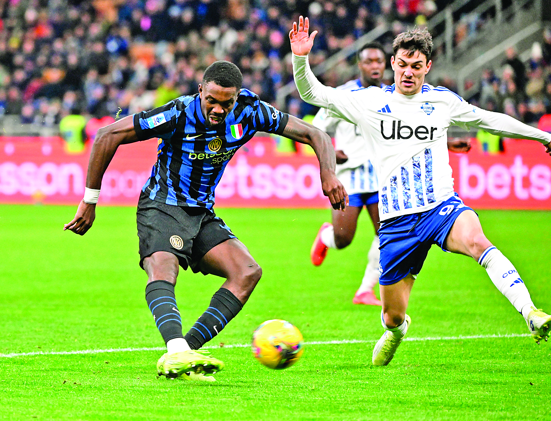 12月23日,国际米兰队球员图拉姆(左)在比赛中射门得分。