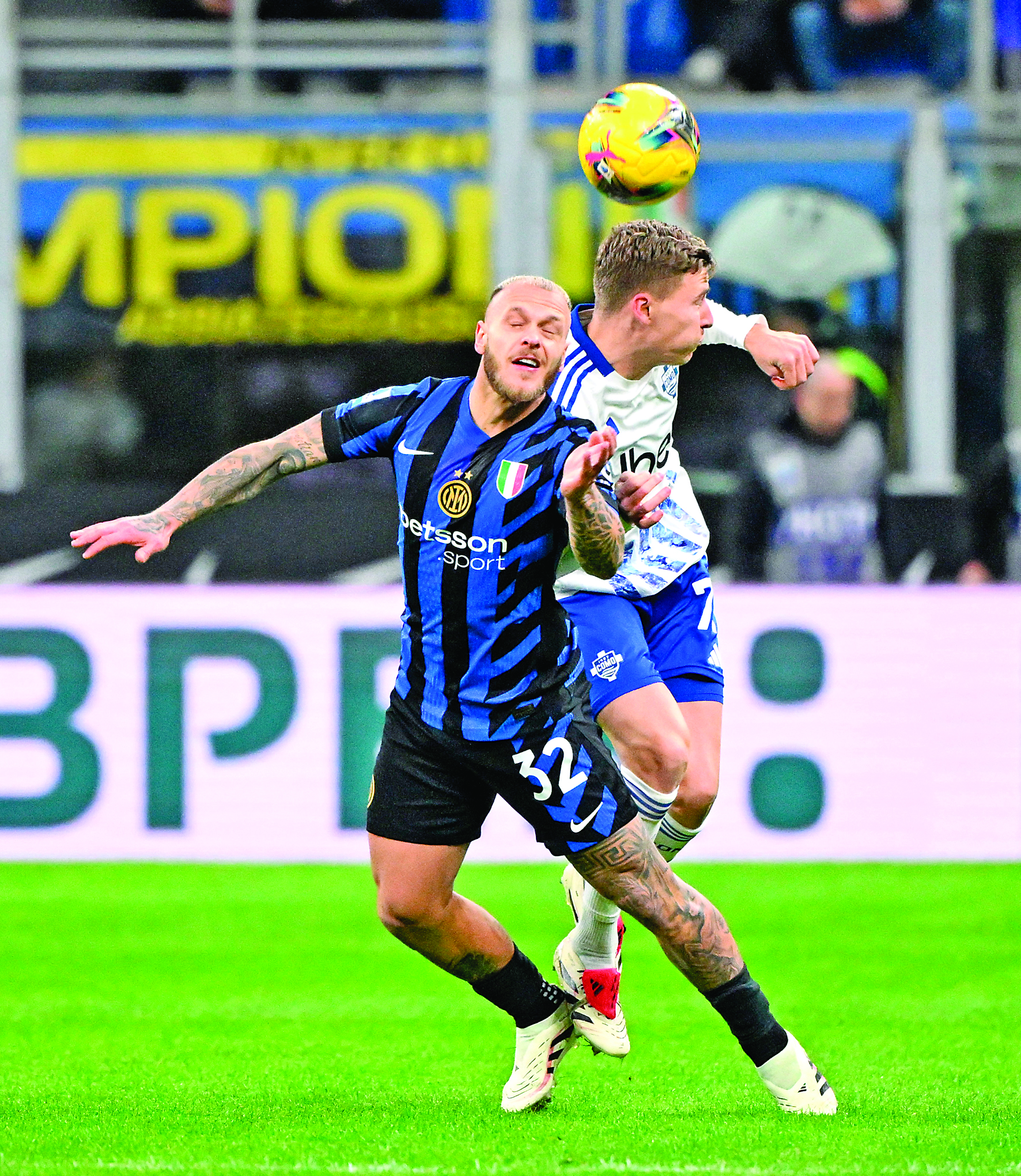 12月23日,国际米兰队球员迪马尔科(左)与科莫队球员范德布雷普特在比赛中争顶。 当日,在2024~2025赛季意大利足球甲级联赛第17轮比赛中,国际米兰队主场2比0战胜科莫队。