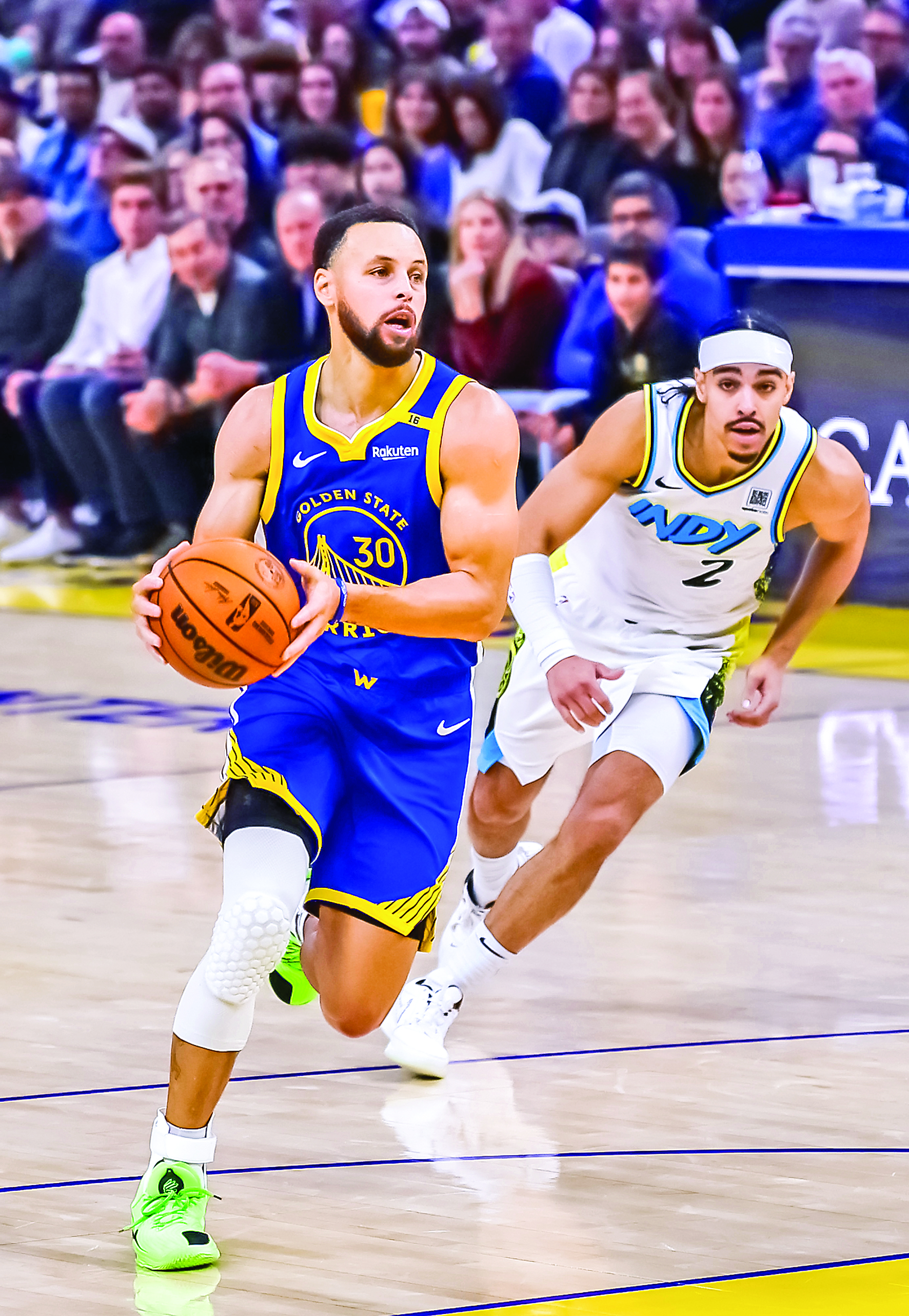 12月23日,勇士队球员库里(左)在比赛中进攻。当日,在2024~2025赛季NBA常规赛中,金州勇士队主场105比111不敌印第安纳步行者队。 新华社发(董旭东 摄)