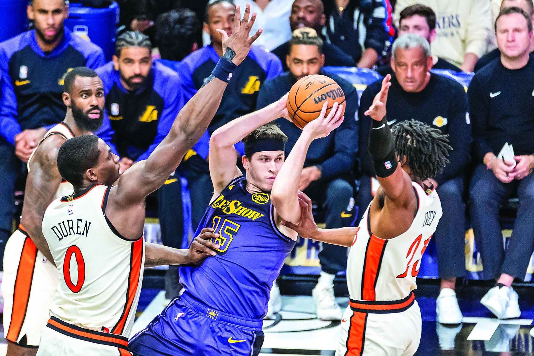 12月23日,湖人队球员奥斯汀·里夫斯(中)在比赛中进攻受阻。当日,在2024~2025赛季NBA常规赛中,底特律活塞队客场117比114战胜洛杉矶湖人队。