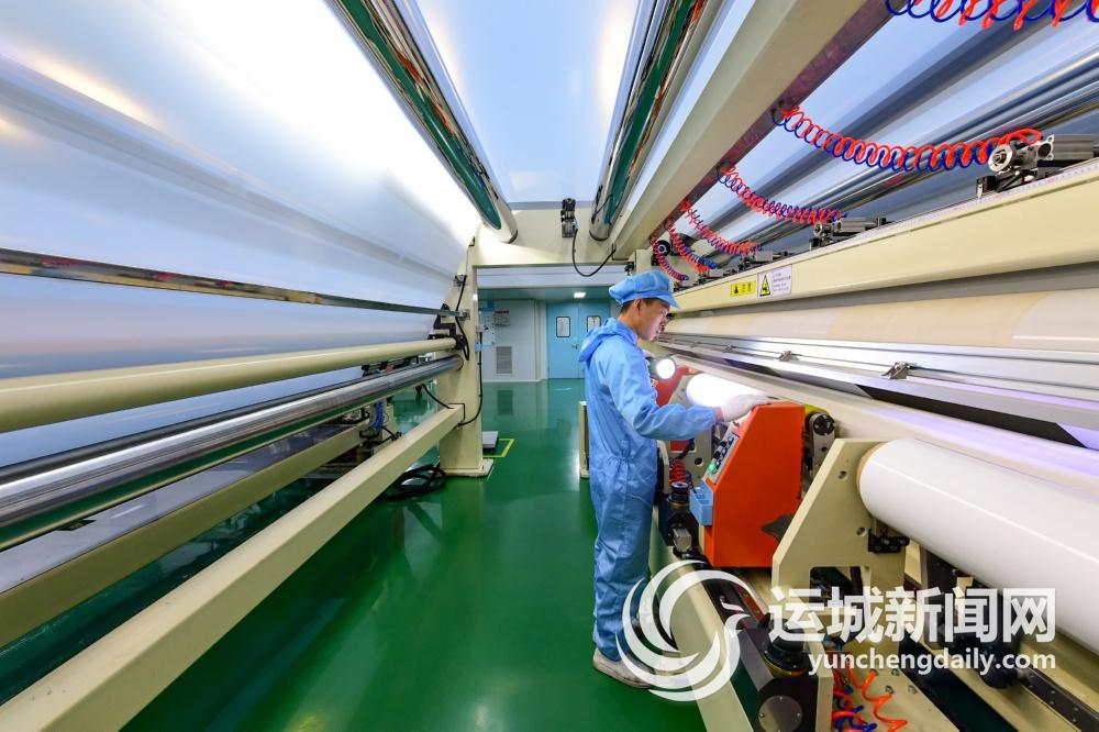 在位于永济经济技术开发区的山西蓝科途新材料科技有限公司,偌大的无尘生产车间里,伴随着机器轰鸣声,多条生产线正开足马力运转,经过牵引、纵拉、横拉、萃取、定型等多道工序后,聚乙烯粉末等原材料被拉伸成一张薄薄的“塑料布”,这些“塑料布”便是锂电池的四大关键材料之一——锂电池隔膜。
