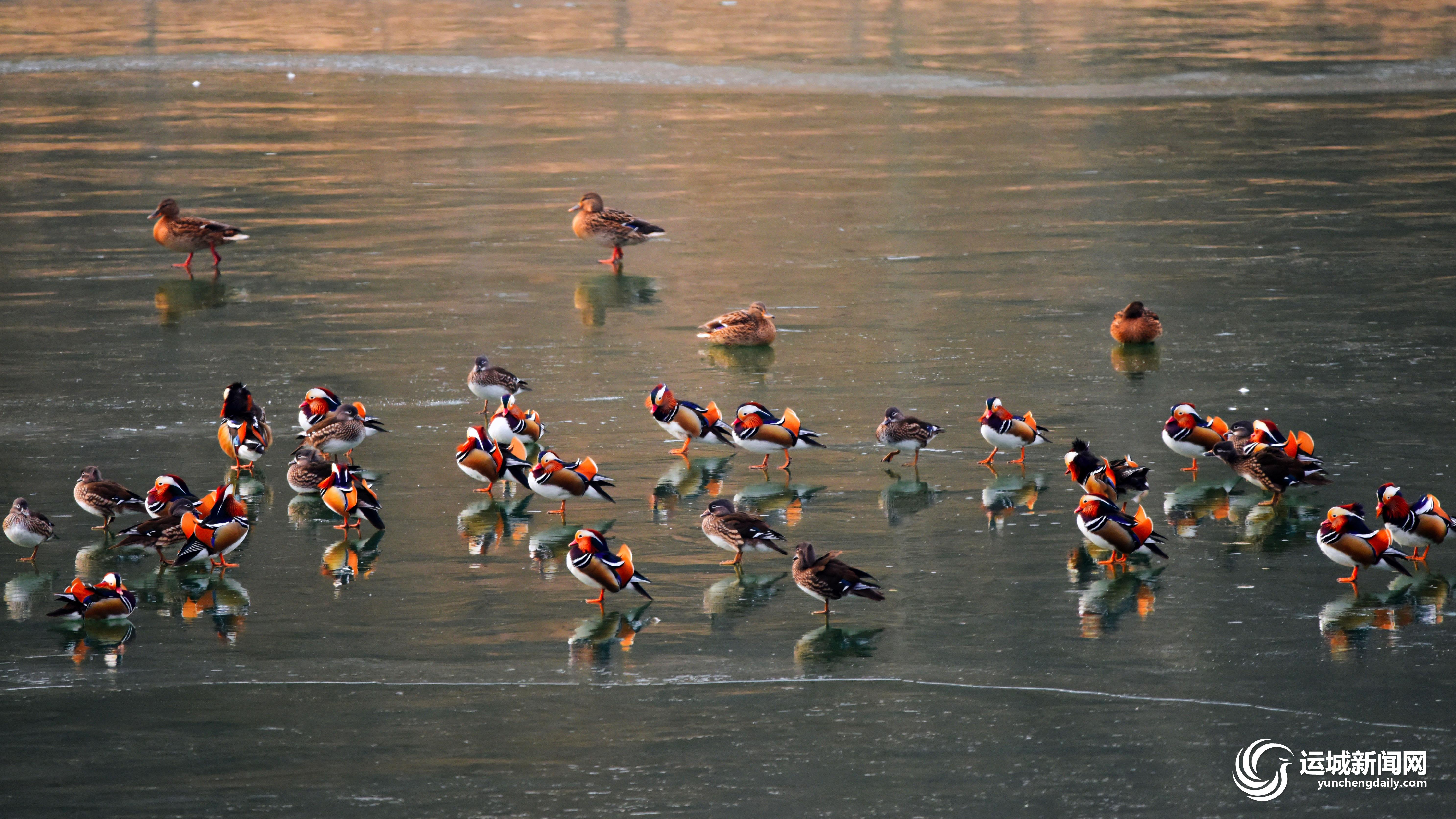 2024年12月29日,在闻喜县后宫乡小涧河水库,成群的鸳鸯和绿头鸭等在水中栖息。
