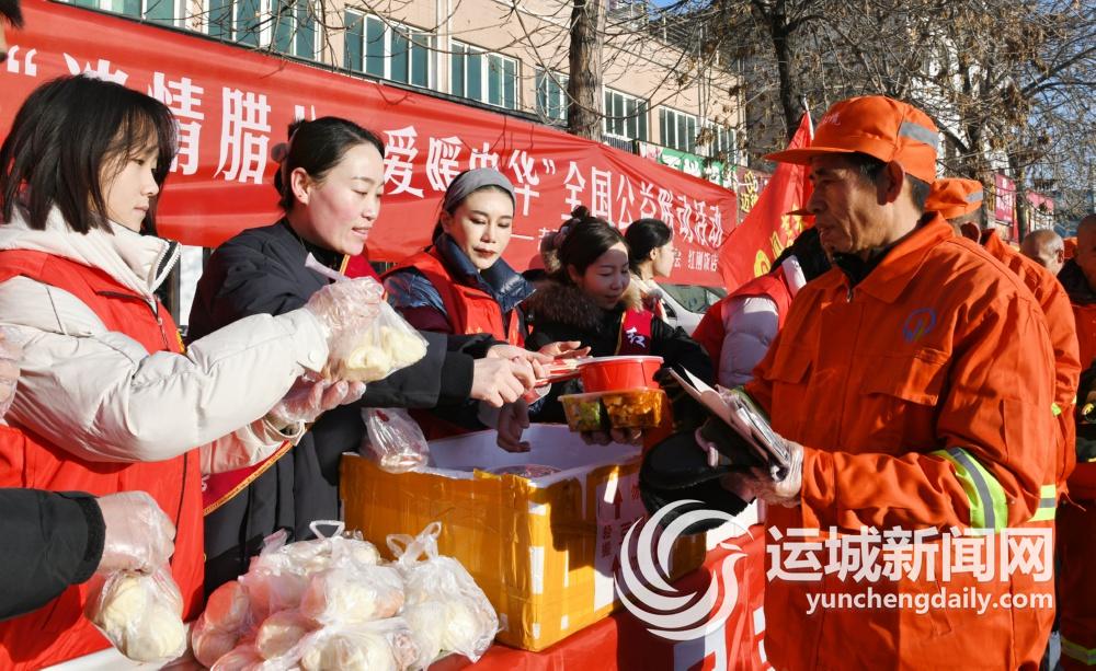 1月6日,闻喜县善行志愿者协会和东镇红刚饭店联合开展公益活动。志愿者们将一碗碗热气腾腾的腊八粥递到环卫工人手中,并赠送了手套、耳帽等防寒慰问品,在寒冷的冬日传递温暖。