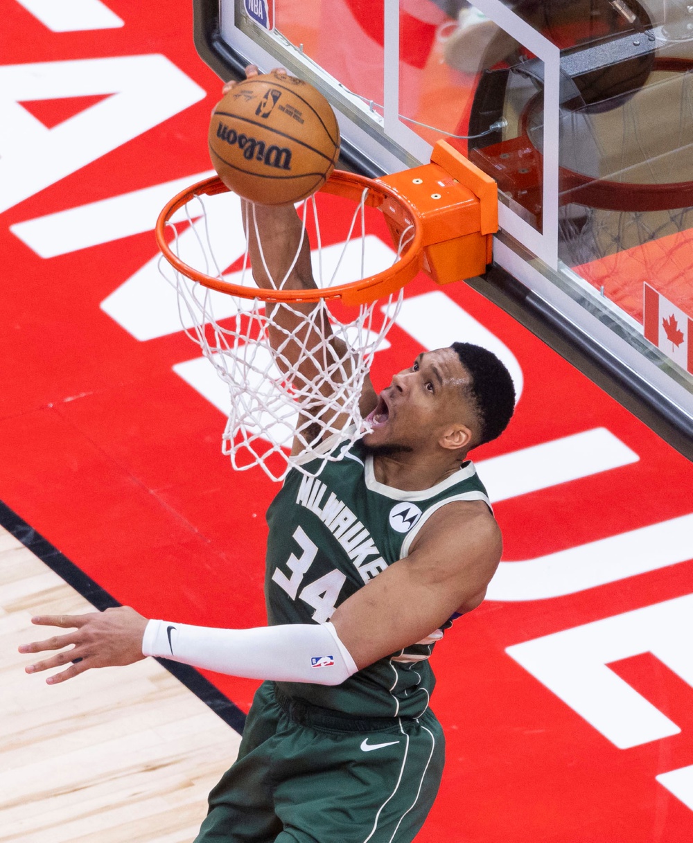 雄鹿队球员安特托昆博在比赛中扣篮。