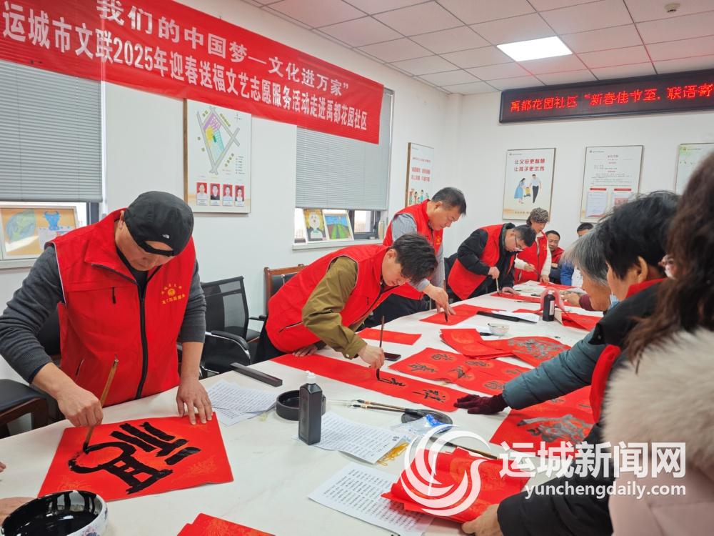 运城晚报讯(记者 王捷)“迎新春快乐祥和;庆佳节顺意平安”“心想事成福临门;万事如意财运通”“鸟鸣花艳春光好;人寿年丰喜事多”……1月7日上午,中心城区禹都花园社区党群活动中心热闹非凡、年味十足。运城市书法家协会近20位书法家提笔挥毫,为居民义写春联,送去节日的问候。这也标志着“我们的中国梦——文化进万家”运城市文联2025迎春送福文艺志愿活动正式启动。