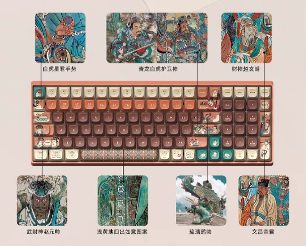 这款键盘融合永乐宫建筑及壁画元素,使壁画中的众多神仙人物一“键”下凡,与大家亲密互动。此外,根据人物形象,键盘中还配有个性化表情包与语言,趣味满满。