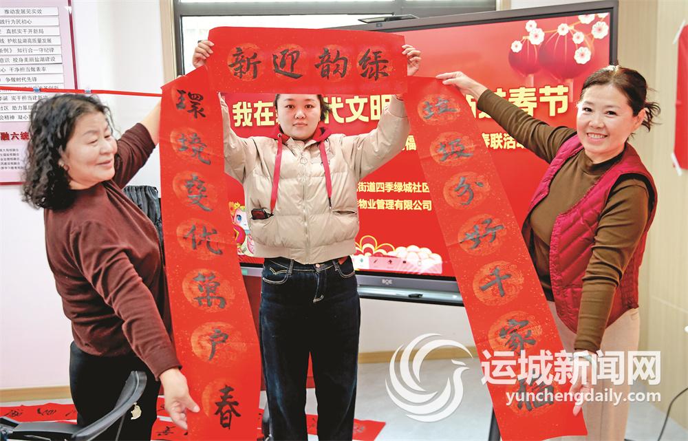 运城晚报讯(记者 张国平)“龙岁已开新世界,蛇年又展好春光。这副春联内容好,我要了。”“大家看我写的‘福’字怎么样?”1月10日,盐湖区北城街道四季绿城社区开展书春活动,为辖区居民送上新春祝福。