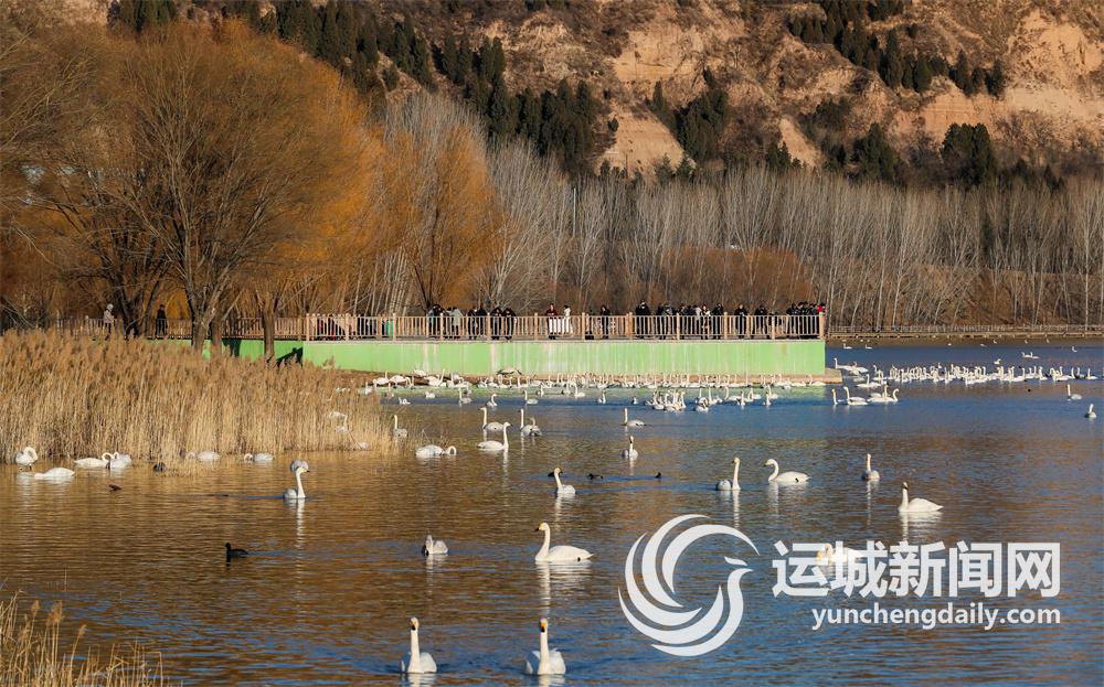 冬日的平陆县三湾大天鹅生态湿地公园,来自全国各地的游客在观赏大天鹅。