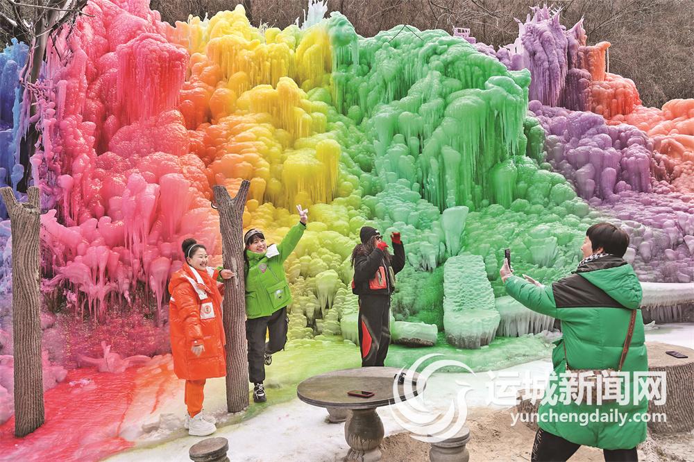 近日,游客在永济五老峰景区观赏七彩冰瀑。