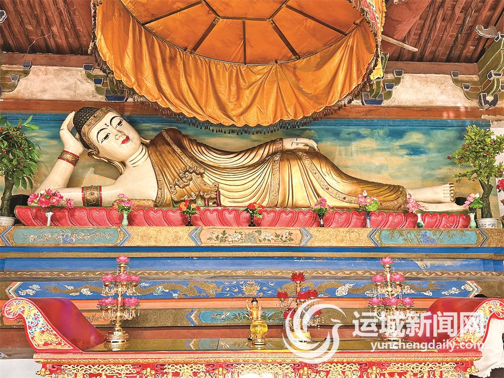 大殿修建得十分宏伟,殿前一尊观音亭亭玉立,乘着一条长长的金龙,很是威武。走进殿内,正中供奉着一尊巨型白玉雕塑的释迦牟尼卧像。其体态轻盈,头西脚东,手臂撑着头,双目微阖,身着金袍,横卧在帷幔半启的莲花座上,神态安详。