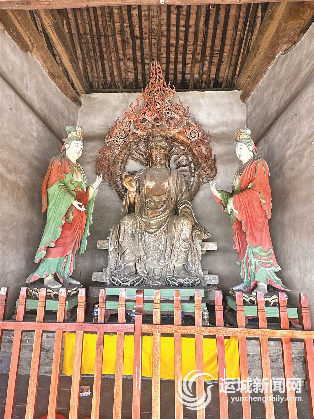 殿内中间供奉着释迦牟尼佛,两旁立着阿难、迦叶二弟子与文殊、普贤二菩萨,两侧各有三尊罗汉,背后塑有韦驮菩萨立像。这些彩塑形态各异,栩栩如生,或慈悲祥和,或庄严肃穆,每一尊都仿佛有灵魂,默默诉说着过往,对研究晋南彩塑具有极高的历史、艺术价值。