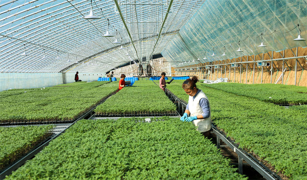 1月7日,夏县庙前镇杨村现代农业科技示范园育苗大棚里,员工对苗床上蔬菜秧苗进行管护,呈现一派繁忙景象。