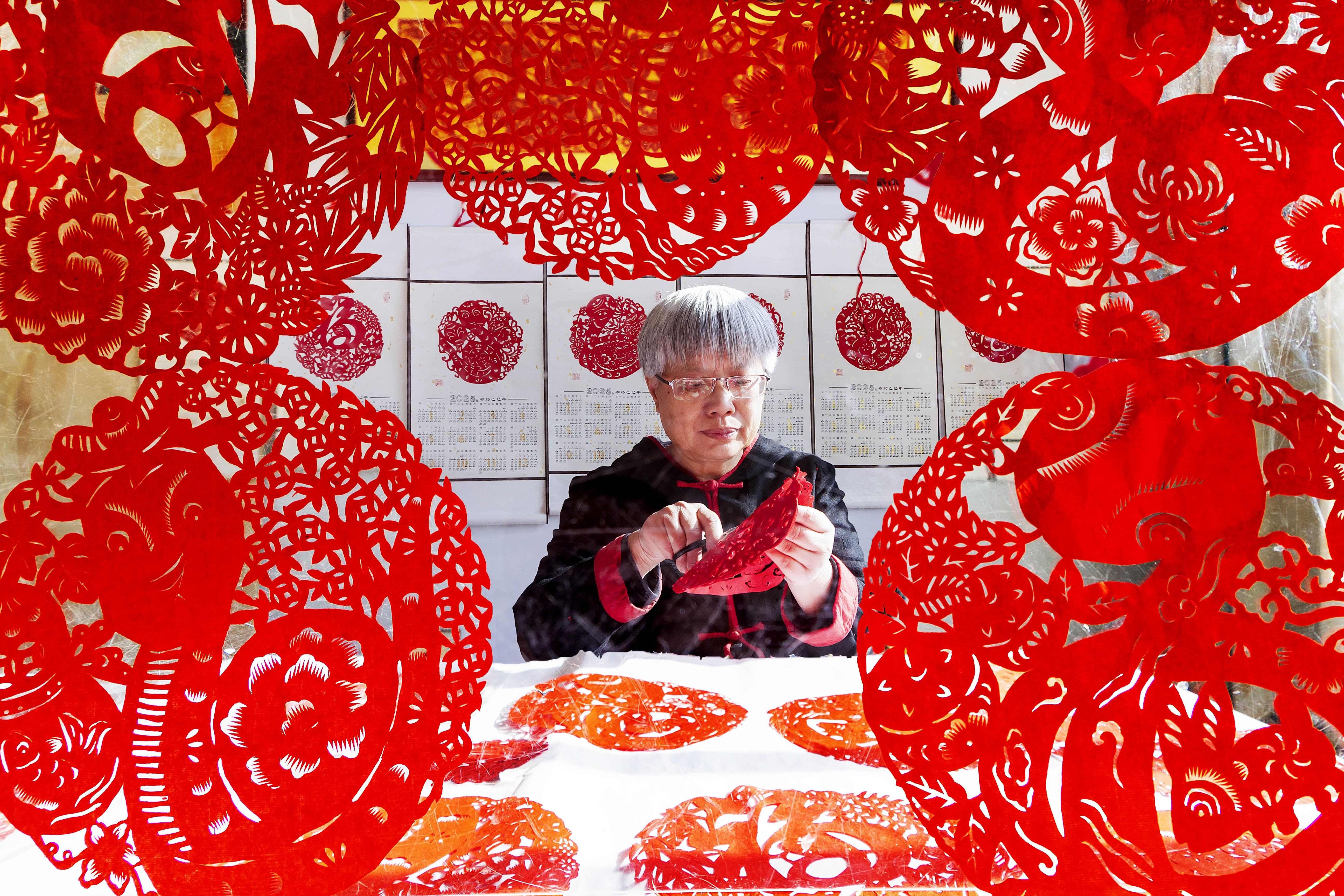 1月17日,盐湖区非物质文化遗产(剪纸)传承人、退休教师李惠芳在创作蛇年系列剪纸作品。