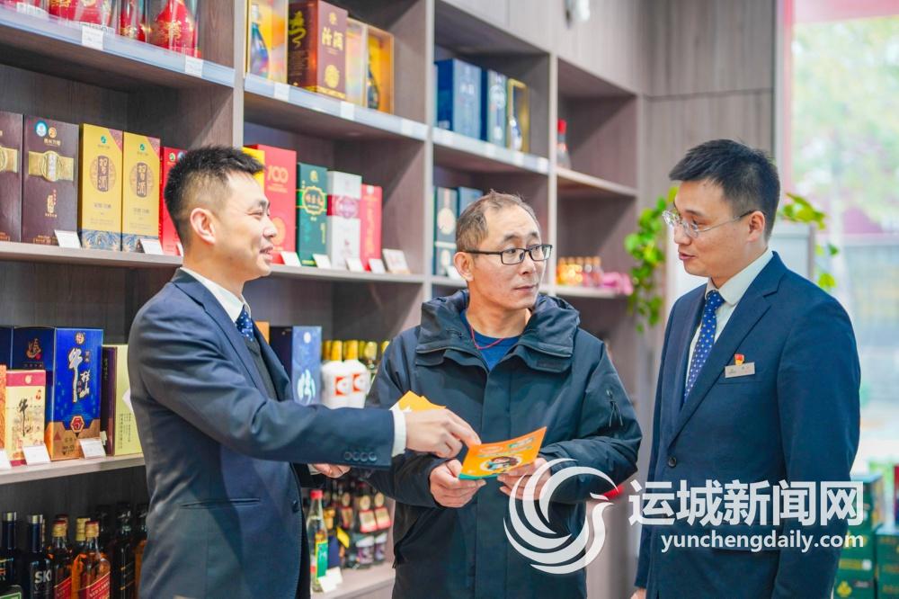 在夏县城区一实体酒品商店内,农商行的工作人员正在给商户介绍贷款政策。