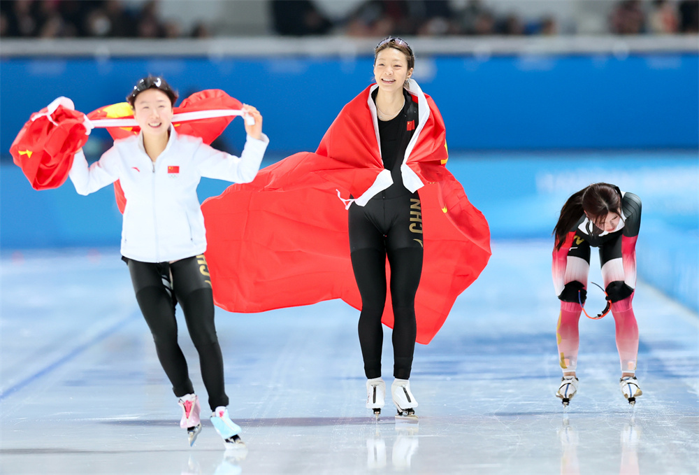 黑龙江省冰上训练中心速滑馆里,《义勇军进行曲》三度奏响。当日速度滑冰全部3枚金牌均被中国队收入囊中。高亭宇先以0.02秒的微弱优势力压日本选手森重航,夺得男子500米冠军;又与队友廉子文、宁忠岩合作,夺得男子短距离团体追逐金牌。女队则又一次让三面五星红旗同时升起,杨滨瑜、韩梅、太智恩分获女子3000米前三名。本届亚冬会有三金入账的高亭宇坦言不知道这会不会是自己最后一届亚冬会,“(这次)我的关键词是努力,相信大家一起努力,中国速度滑冰会越来越好”。