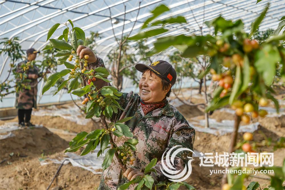 2月10日,平陆县部官镇的一家大棚樱桃采摘园里,繁茂的樱桃树上挂满了果实,村民们抢抓农时实施疏果。