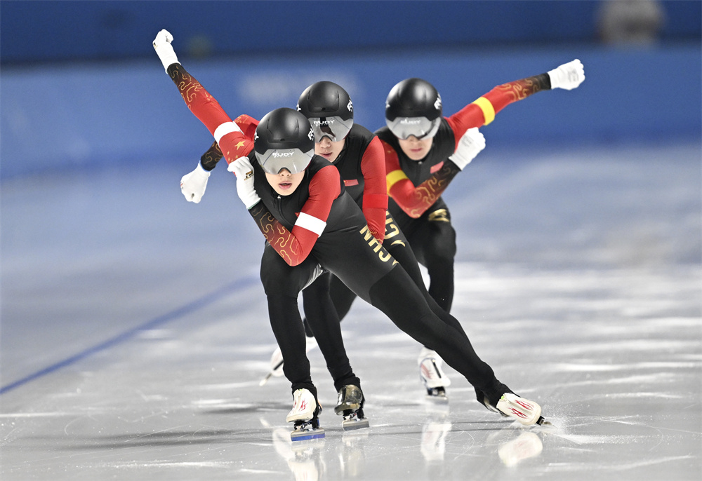 当日,第九届亚冬会速度滑冰男子团体追逐决赛在哈尔滨举行。中国队夺得冠军。