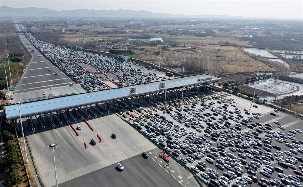 2月4日,节后返程车辆通过合宁高速公路吴庄收费站(无人机照片)。新华社发(沈 果 摄)