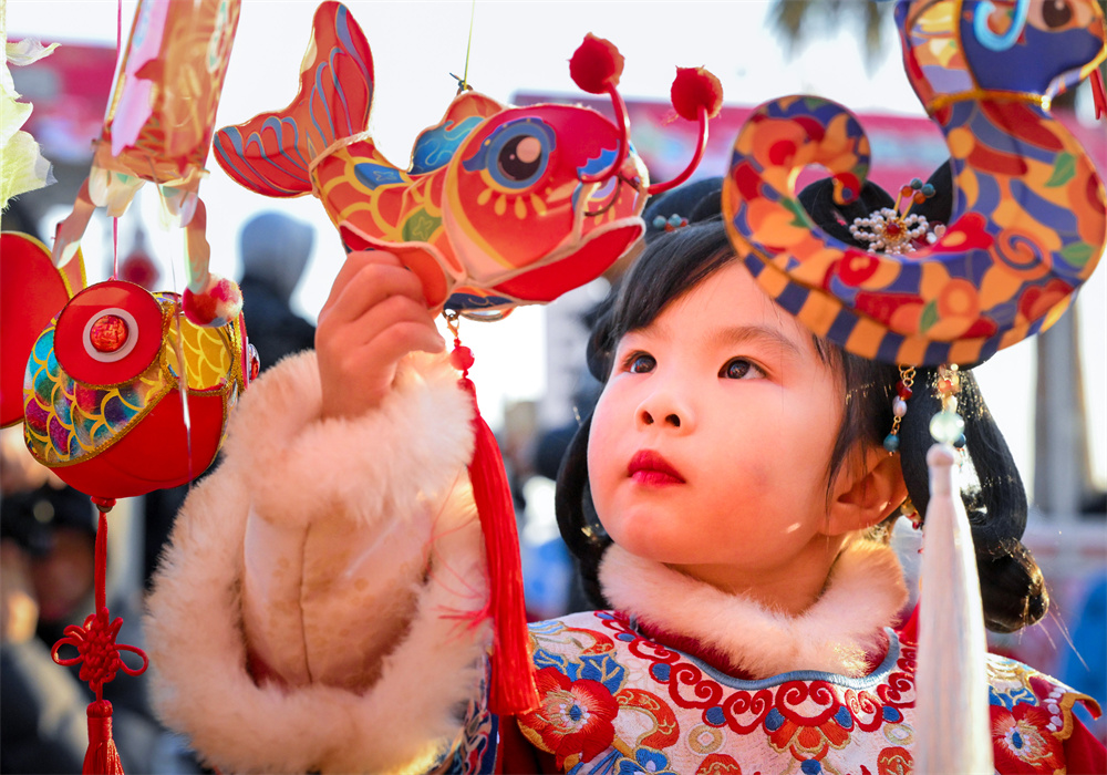 2月9日,一名小朋友在浙江省宁波市宁海县强蛟镇峡山村迎元宵节活动中专注赏灯。元宵节临近,各地举办丰富多彩的民俗活动,欢欢喜喜迎佳节。