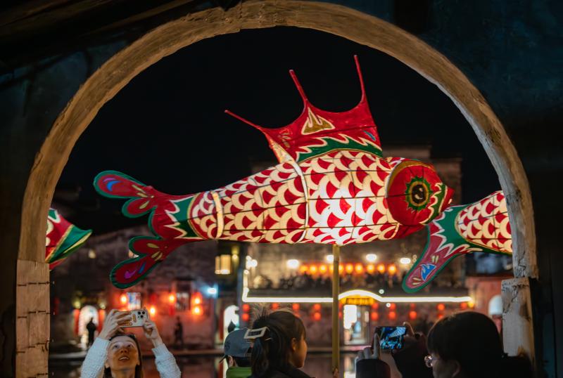 当晚,一场热闹的“元宵闹灯会”在世界文化遗产地安徽省黄山市黟县宏村举行,缤纷多彩的花灯交织起舞,在古村中巡游祈福,吸引众多游客围观欣赏。 新华社发(汪 澄 摄)