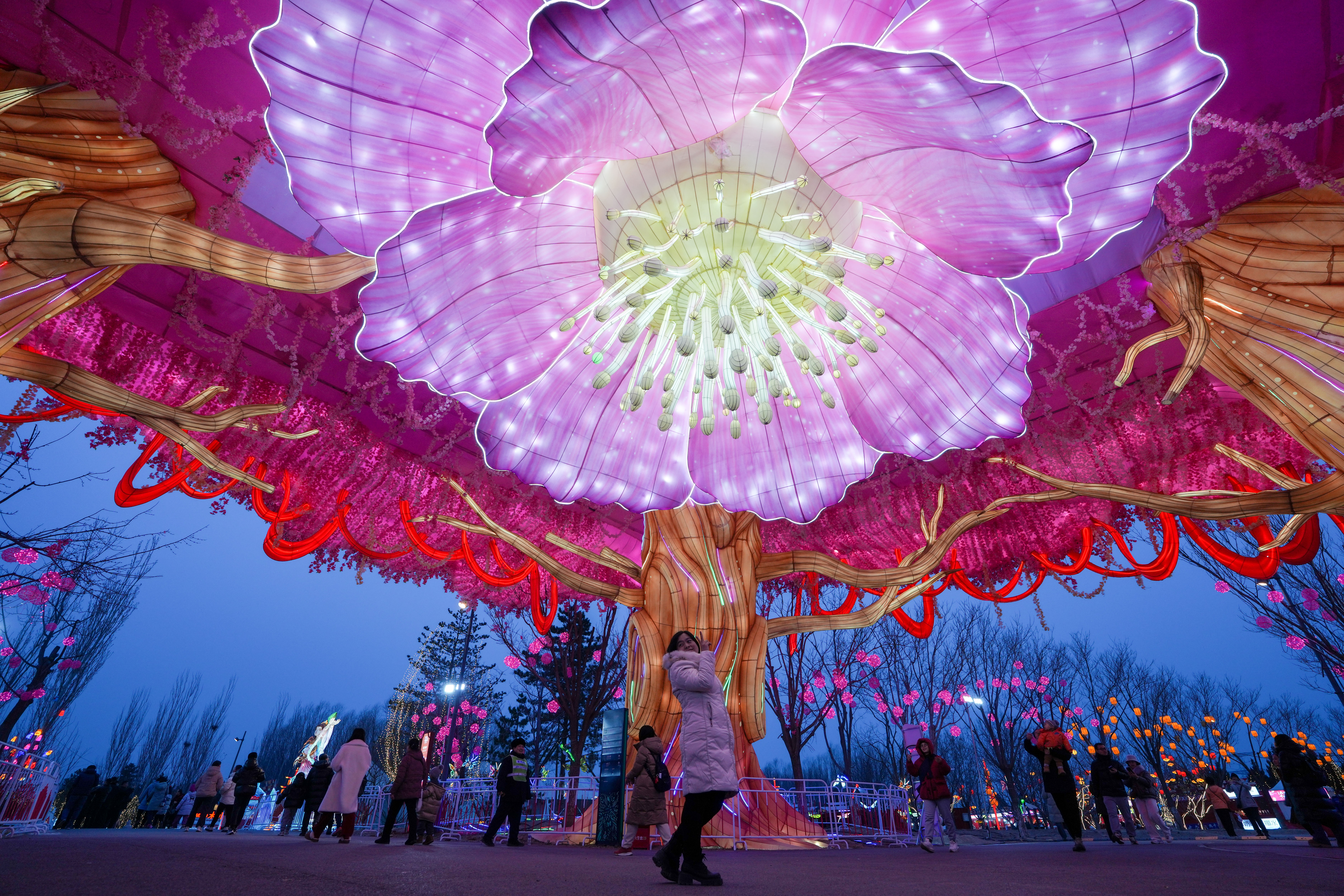 在北京市温榆河公园举行的“2025北京千灯夜”上,市民游客在参观展出的花灯作品“桃花仙境”(2月11日摄)。