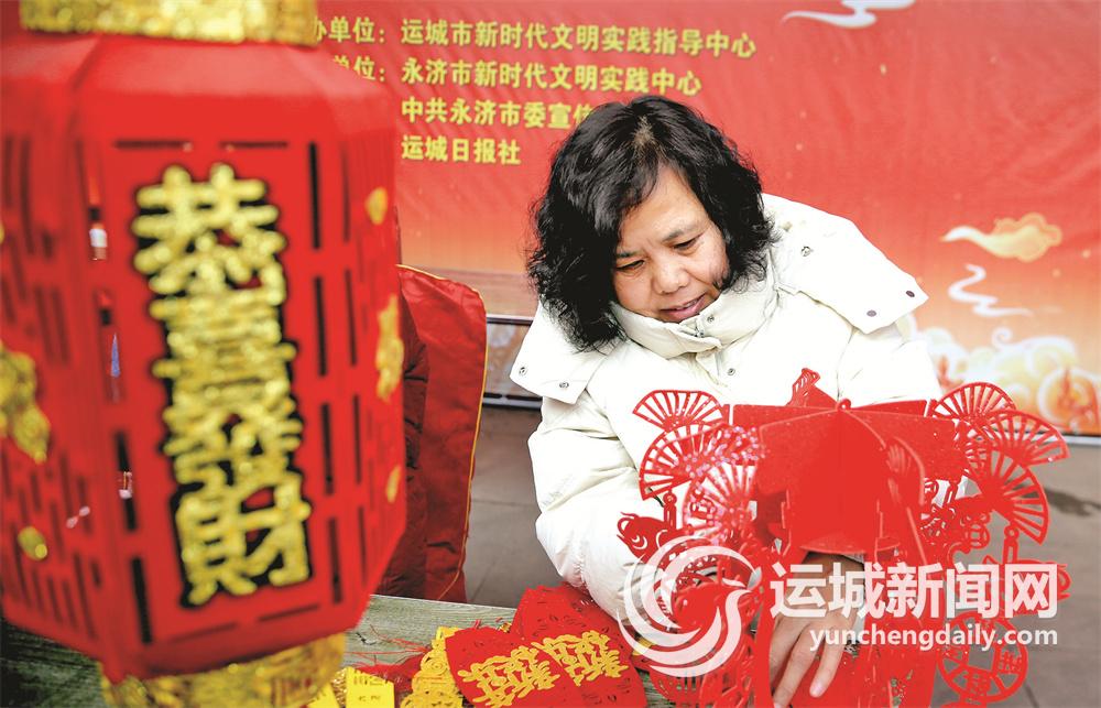 麦秸画、蒲州陶,让人们一饱眼福,而剪窗花则让人们过了把手瘾。“运剪的时候要慢一些,按照纸的折痕去剪,就剪出这个‘花好月圆’了。”剪纸艺人李惠芳一边介绍,一边示范,“这两个就送给你们了,祝你们所愿皆所成,完美且圆满。”