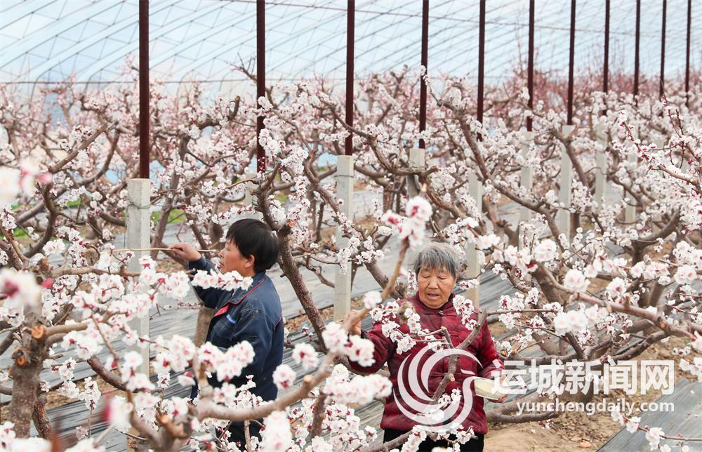 2月11日,夏县胡张乡西下冯村的设施大棚内,杏花竞相绽放,果农们忙着授粉,一派人勤春早的繁忙景象。